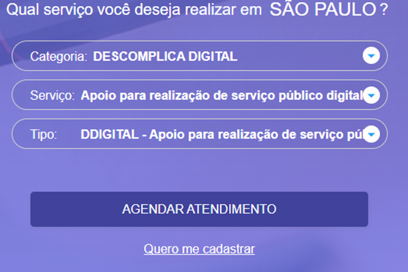 2) Na tela inicial, selecione a categoria *Descomplica digital entre as opções e o serviço *Apoio para realização de serviço público digital, e Tipo: DDIGITAL - Apoio para realização de serviço público, depois Clique em “Agendar Atendimento”;